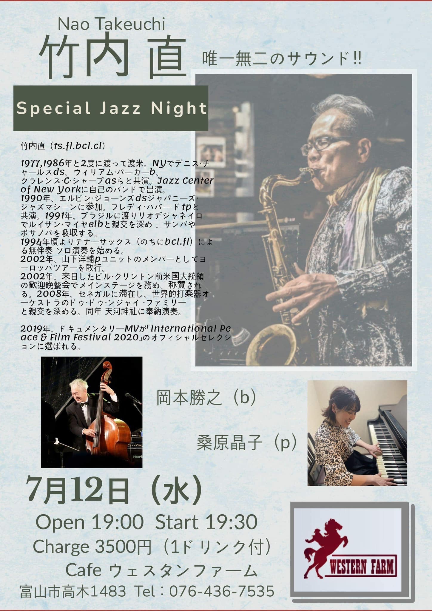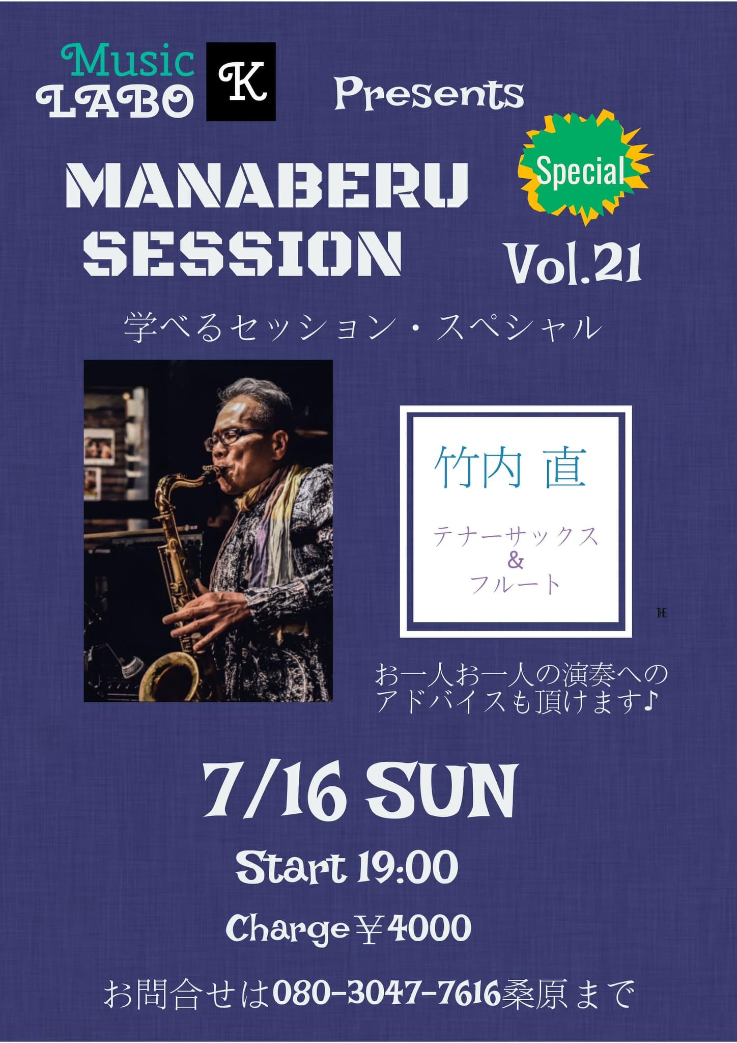 東京より素晴らしいテナーサックス🎷、フルート奏者の竹内直さんによる講座&セッションです。