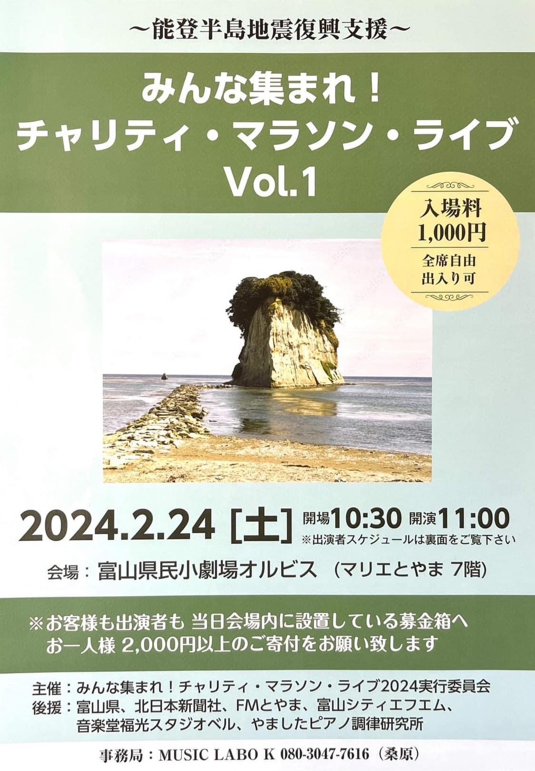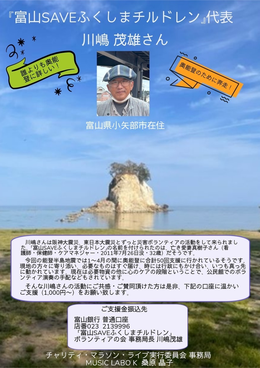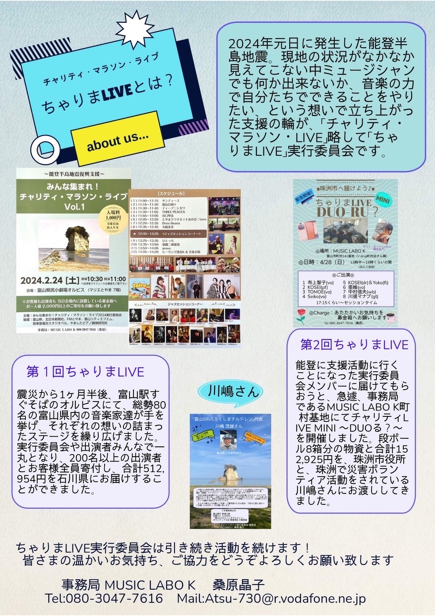 令和6年元日にお隣の石川県で発生した能登半島地震。富山県内でも甚大な被害を目の当たりにし、私たち音楽家も音楽の力でなにか出来ないか、と仲間たちと立ち上がり、富山県内のプロアマ、ジャンルの分け隔てなく合計80名の出演者で演奏と気持ちを繋ぎ、合計512,954円の温かいお気持ちを石川県に届けることができた、チャリティ・マラソン・ライブ、略して『ちゃりまLIVE』(2/24)。